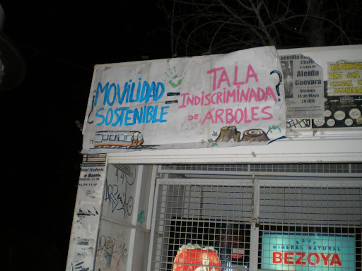 Los universitarios, precupados por el medio ambiente, no comprendemos porqué no se ha optado a trasplantar los árboles. Denunciamos, mediante la colocación de pancartas sobre la parada del bus, esta tala indiscriminada.